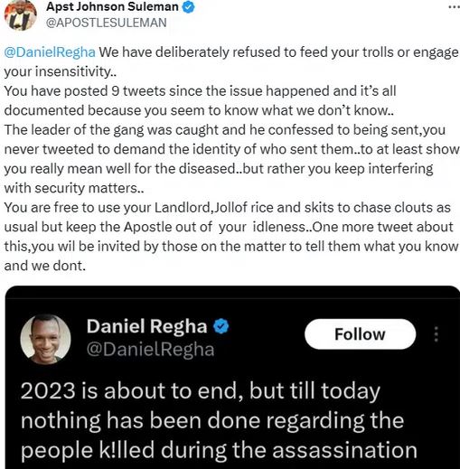 You are free to use your Landlord,Jollof rice and skits to chase clouts as usual but keep the Apostle out of your idleness..One more tweet about this,you wil be invited by those on the matter to tell them what you know and we dont.''