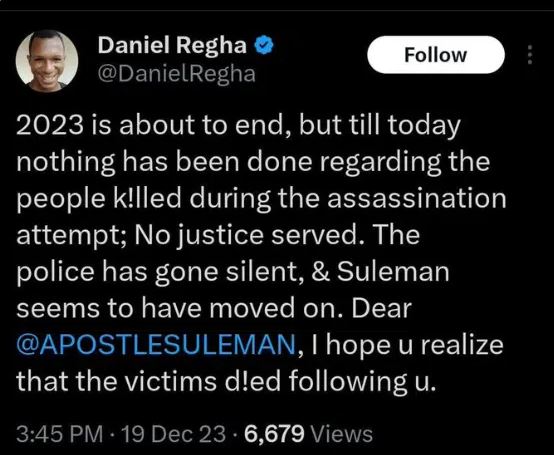 Reacting to this, Apostle Suleman averred that Regha intentionally left out the part where the leader of the gang confessed to having been sent, but has continued to drag him over the matter.