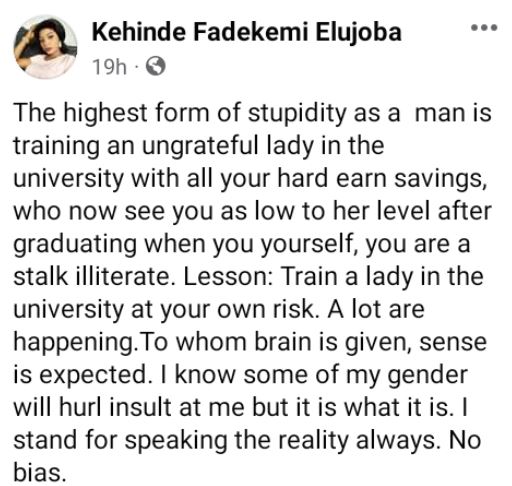 “The highest form of stupidity as a man is training an ungrateful lady in the university with all your hard earned savings, who now see you as low to her level after graduating when you yourself, you are a stalk illiterate,” she wrote in a Facebook post on Thursday, December 21.