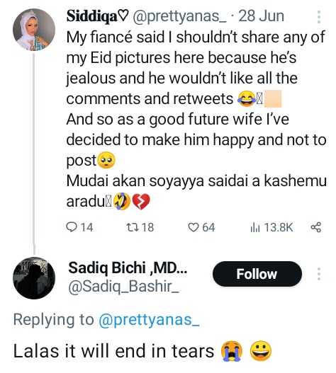 The new bride had on June 28, 2023, disclosed that her fiancé (now husband) said she shouldn't post her Eid photos and she obeyed him.