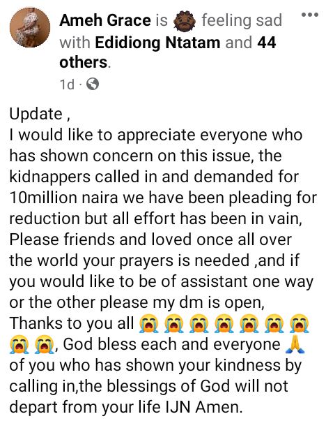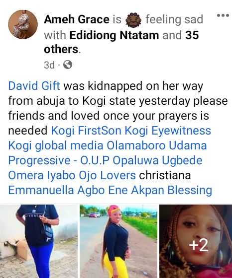 In a Facebook post on Tuesday, December 26, one Ameh Grace, a family member of one of the victims identified as Gift David, said the abductors contacted them, demanding for N10m ransom.
