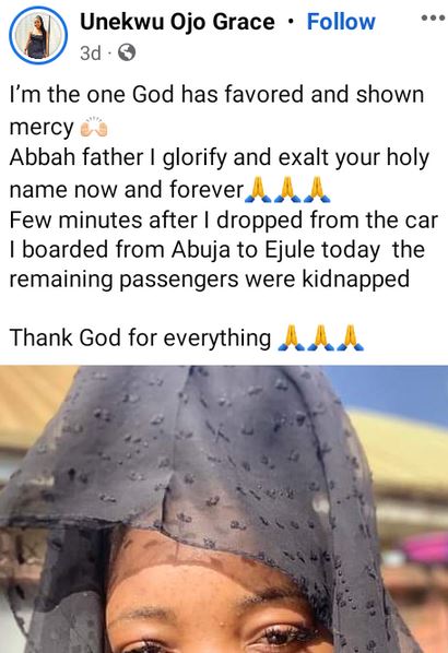 Gift was said to be travelling from Abuja to her village for the yuletide when the gunmen attacked the vehicle she boarded and whisked the passengers away to an unknown destination.