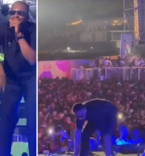 The reality TV star fell off the stage while performing his song at singer Davido's concert in Lagos last night December 27.