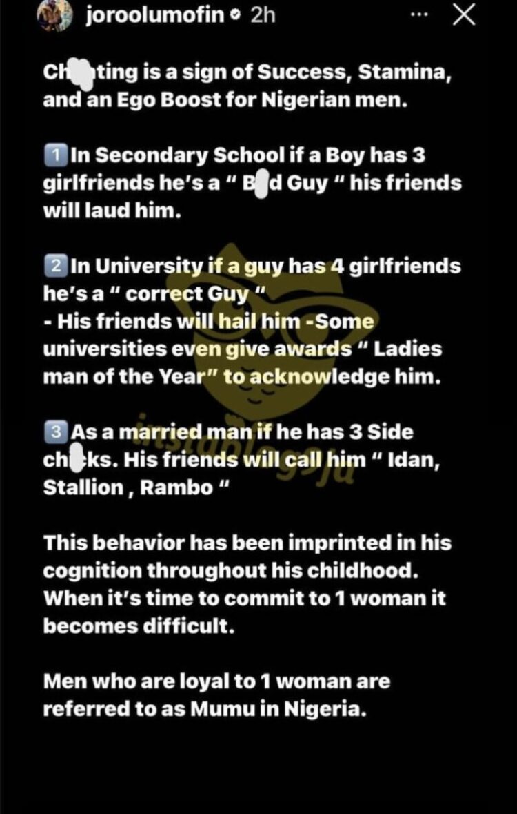 Joro revealed that in Nigeria, cheating is seen as a symbol of success and masculinity among men.