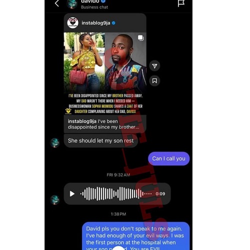 Details of the chat between Davido and Savage showed that he sent a message to Savage about a post by an Instagram blog talking about his daughter, Imade complaining that she has not seen his father since the death of Ifeanyi.