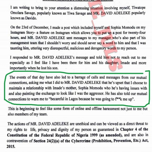 In the petition, Savage asked the police to hold Davido accountable for any harm to her or her family.