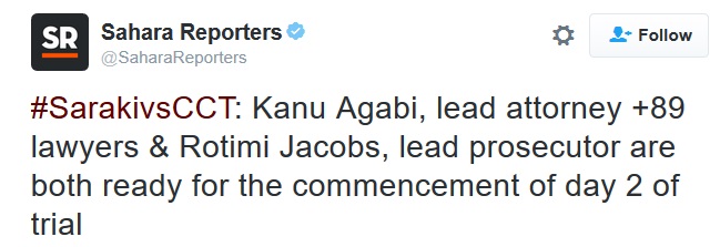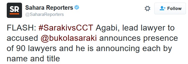 But on Wednesday, Kanu Agabi (SAN), Saraki’s lead counsel, reeled off 90 names, including that of four senior lawyers. He jokingly told Danladi Umar, chairman of the tribunal, that he would go down in history as one of the judges before whom the highest number lawyers appeared.