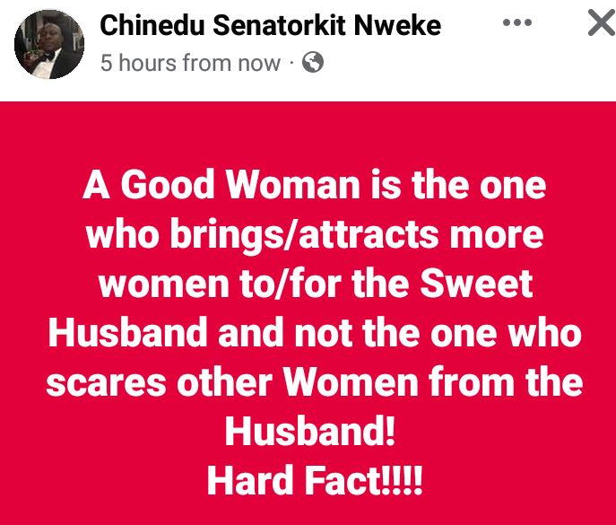 A Nigerian man, Chinedu Nweke, has taken to Facebook to give his definition of a "good woman". According to him, good women attract/bring more women to/for their husbands, instead of scaring the women away.