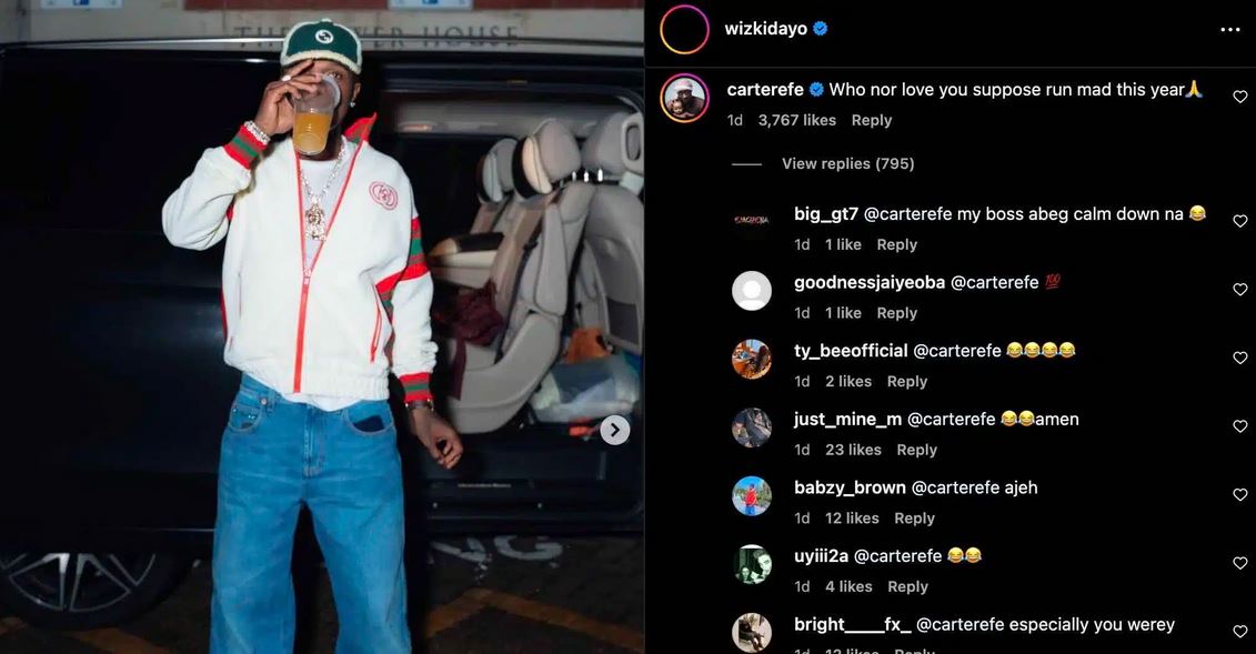 Commenting in the section of Wizkid’s post, Carter Efe expressed admiration for Wizkid’s photos and went as far as asserting that anyone who does not love Wizkid will go mad in the new year, 2024.