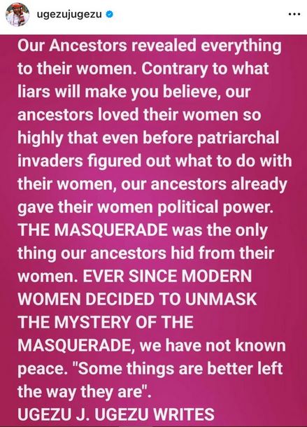In a post shared on Instagram, Ugezu opined that African ancestors loved women and even gave them political powers.