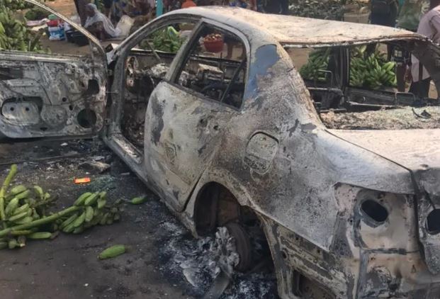 An angry mob gathered after the accident and burnt the driver's Toyota Corolla as the driver fled the scene.