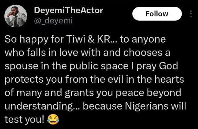 In his words: “So happy for Tiwi & KR… to anyone who falls in love with and chooses a spouse in the public space I pray God protects you from the evil in the hearts of many and grants you peace beyond understanding… because Nigerians will test you!”