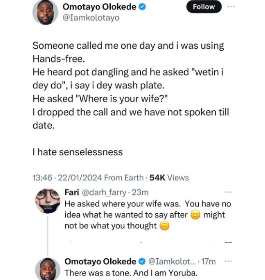 In a post shared on X, Olokede said he was doing the dishes when a friend of his called and asked what he was up to.