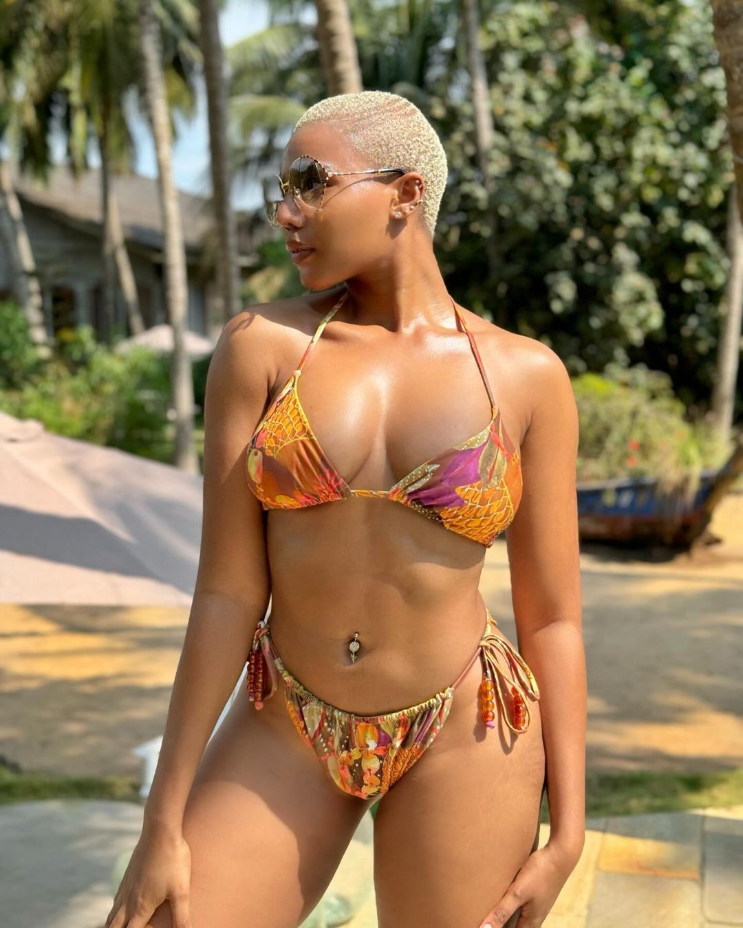 Nancy Isime posed in a multi-colored bikini, highlighting her curves and endowed body parts.