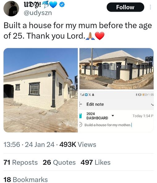"Built a house for my mum before the age of 25. Thank you Lord," he wrote in the caption.