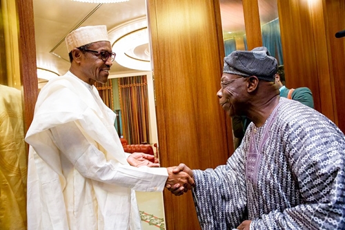 Obasanjo Appears Very Humbled as He Visits President Buhari at Aso Rock Villa (Photos)