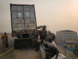 It was gathered that a trailer had crashed into the bridge, leaving the front part of the trailer hanging off the edge of the bridge.