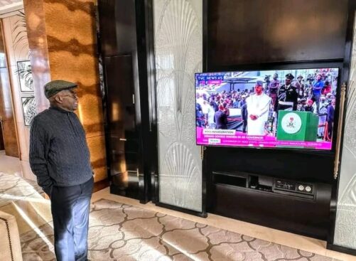 Nigeria's number one man, President Bola Tinubu has been spotted watching the inauguration of Usman Ahmed Ododo as the Governor of Kogi State, from France.