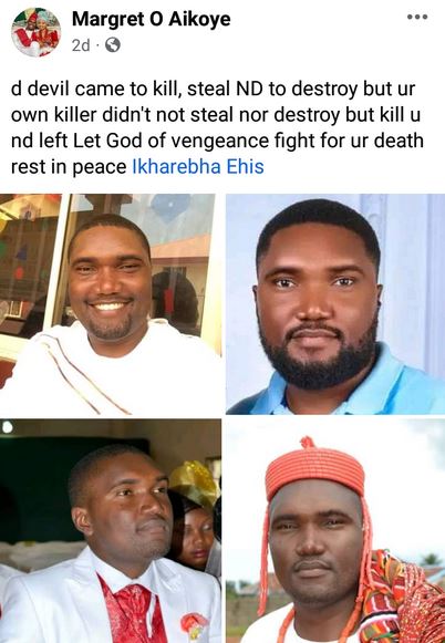 “Rip my hero. All I know is your killer will never know no peace. My consolation is you died in Christ. I don't know why good people don't last. I know you don't like me posting anything on social media but my love I can't oooooo.”