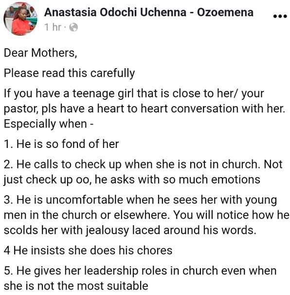 She warned mothers that they should have a conversation with their teenage daughters who have close relationships with their pastors.