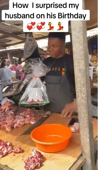 A video has captured the moment the wife of a meat seller surprised him at his stall on his birthday.