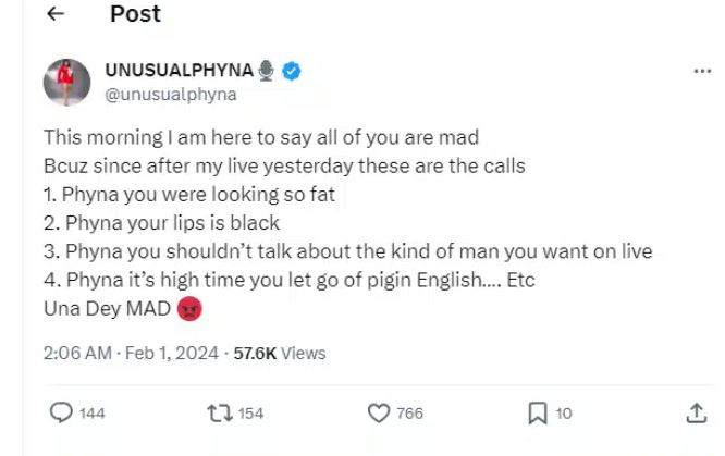 In the early hours of today, Phyna took to the 'X' platform to drag some anonymous people who called to complain to her about her utterances.