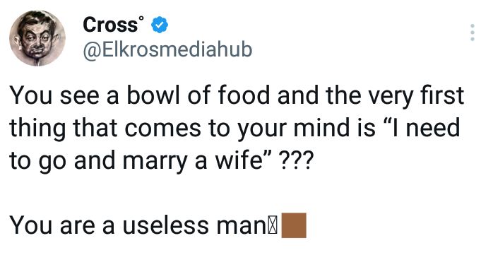 “You see a bowl of food and the very first thing that comes to your mind is “I need to go and marry a wife” ??? You are a useless man” he wrote on Friday, February 2.