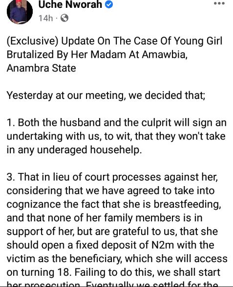 According to the post, the suspect has agreed to open a fixed deposit of N500,000 with the victim as beneficiary. Failure to do so will lead to her prosecution.