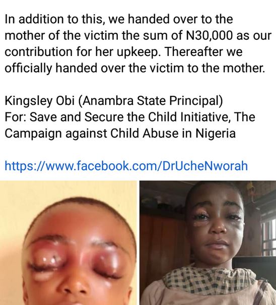 In addition to this, we handed over to the mother of the victim the sum of N30,000 as our contribution for her upkeep. Thereafter we officially handed over the victim to the mother. ''