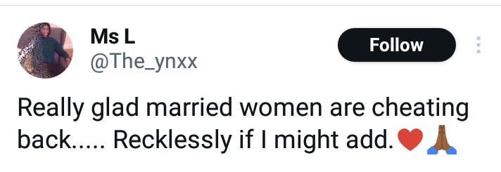 She said she is happy that married women are cheating back.