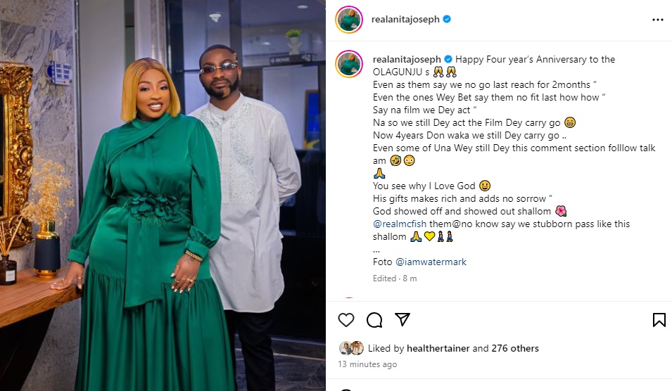 Actress Anita Joseph and her husband, Fisayo Olagunju have celebrated their wedding anniversary.