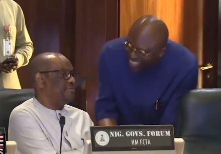 A video has shown the moment Gov Siminalayi Fubara of Rivers State met with the immediate-past governor of the state, Nyesom Wike, at the state council chambers in the Presidential Villa, Abuja during a meeting today, February 15.