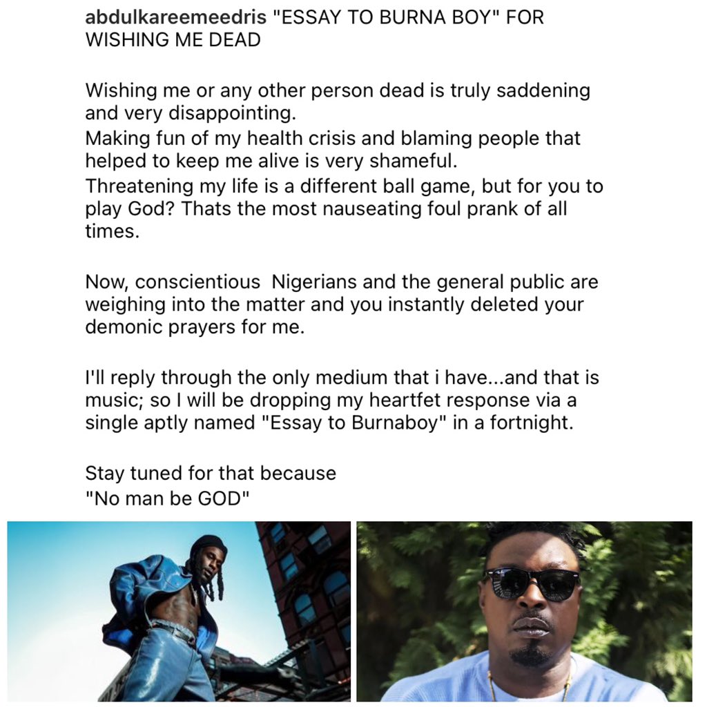 However, reacting via his Instagram page, Abdulkareem said Burna Boy wishing him or any other person dead was “truly saddening and very disappointing. Making fun of my health crisis and blaming people that helped to keep me alive is very shameful.”