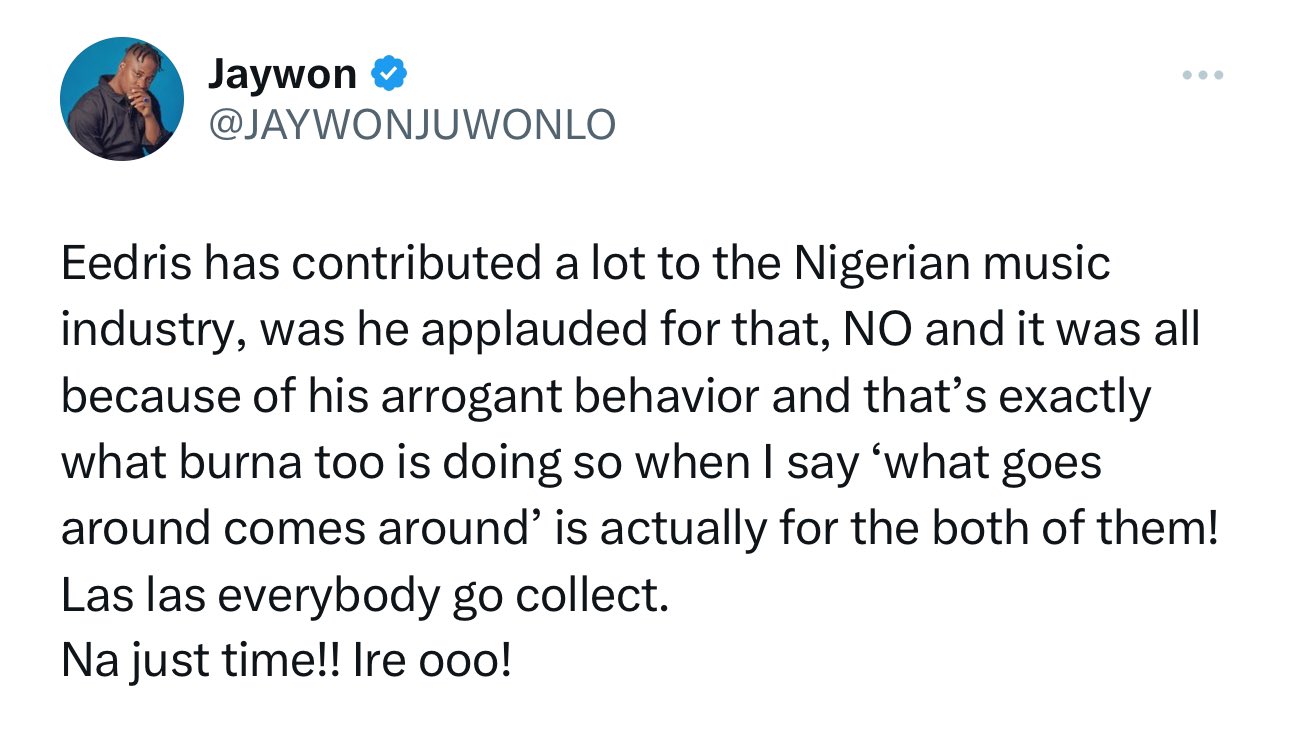 On his X handle, Jaywon wrote: “Eedris has contributed a lot to the Nigerian music industry, was he applauded for that, NO and it was all because of his arrogant behaviour and that’s exactly what Burna too is doing so when I say ‘what goes around comes around’ is actually for the both of them!