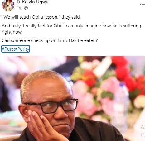 Reverend Kelvin Ugwu stated that he feels for Peter Obi, and wonders whether he has eaten, and he can only imagine how much the politician is suffering at the moment.