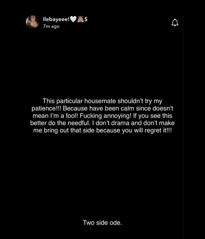 “This particular housemate shouldn’t try my patience!!! Because i’ve been calm since doesn’t mean i’m a fool! I don’t do drama and don’t make me bring out that side because you will regret it!!!!!!” She wrote.