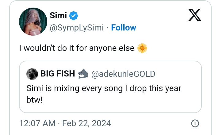 He revealed this on Wednesday, February 21st, simply writing, “Simi is mixing every song I drop this year btw!”