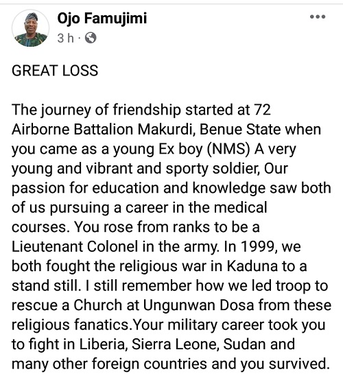 “GREAT LOSS The journey of friendship started at 72 Airborne Battalion Makurdi, Benue State when you came as a young Ex boy (NMS) A very young and vibrant and sporty soldier,” he wrote.