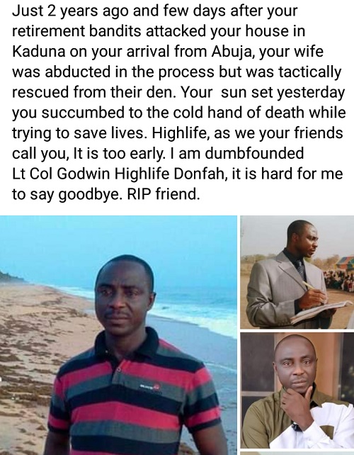 “Your sun set yesterday you succumbed to the cold hand of death while trying to save lives. Highlife, as we your friends call you, It is too early. I am dumbfounded. Lt Col Godwin Highlife Donfah, it is hard for me to say goodbye. RIP friend.”
