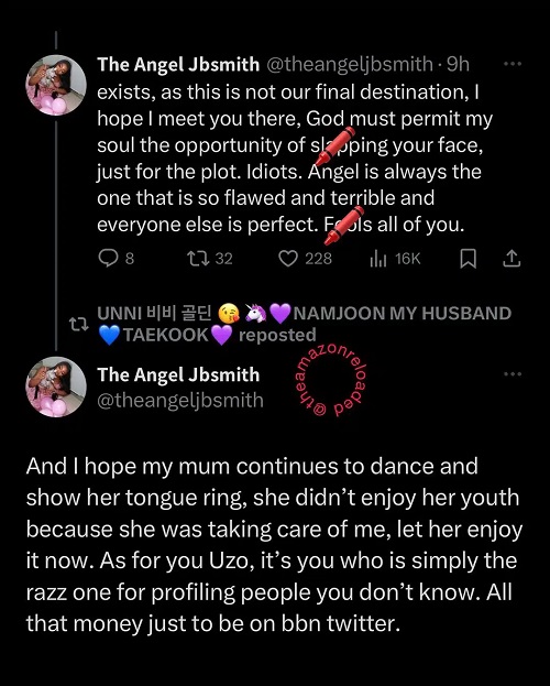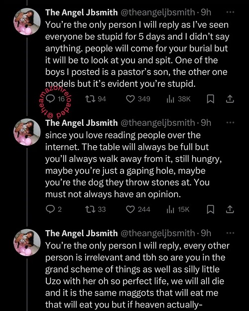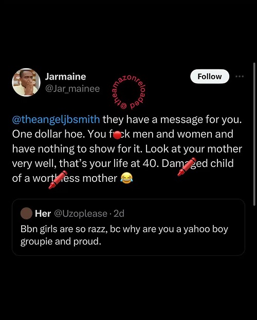 The troll further dragged Angel’s mother while describing Angel as a “damaged child of a worthless mother”.