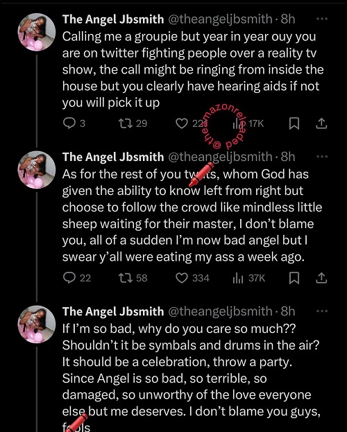 Following the video of Angel with her male friends who were described as “Yahoo boys”, a social media troll took to his page to drag the reality star as he claims she gets intimate with both sexes to make money.