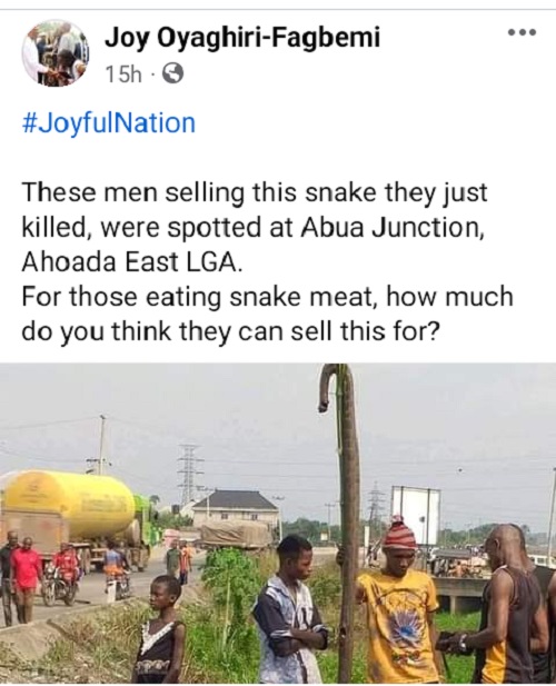 The photo of the snake was shared on Facebook by Joy Oyaghiri-Fagbemi on Wednesday.