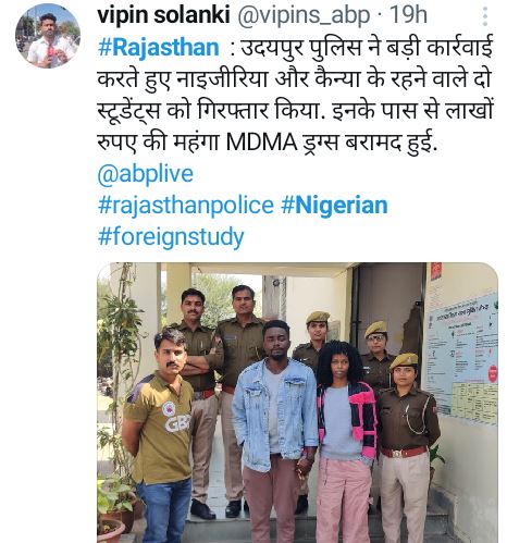 A 34-year-old Nigerian drug peddler and his Kenyan girlfriend have been arrested by Goverdhan Villas police of Udaipur in India after they were allegedly caught with banned drugs, MDMA, valued at ₹5 lakhs.