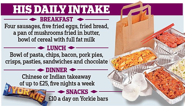 Consuming a staggering 10,000 calories every day – four times the usual daily amount for a man, Mr Thompson binged on Chinese takeaways and pizzas he had delivered to his door and claimed to have spent £10 a day on chocolate, relying on state handouts for money.