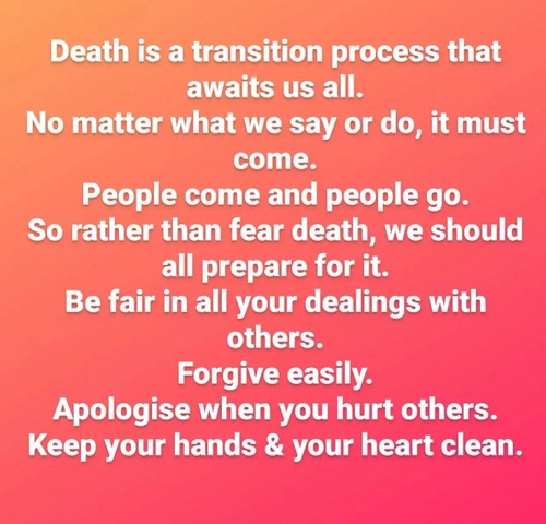 Reacting, he urged his fans and followers not to fear death but to embrace it as a natural transitional process that awaits everyone.