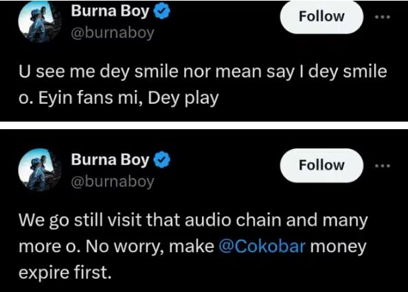Now reacting, Burna Boy stated that the fact he is smiling doesn’t mean he is actually smiling.