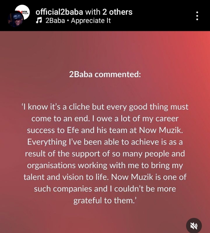 According to a public statement issued by the music management organization Now Muzik, 2Baba and the company have been working together for more than two decades.
