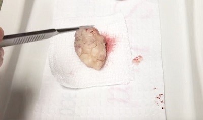 The brain-like growth is then placed on the side before Dr Lee carves into it to discover fat and tissue inside