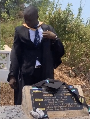A young man has visited his mother’s grave following his graduation from the university.
