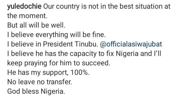 In his words: “Our country is not in the best situation at the moment. But all will be well. I believe everything will be fine. I believe in President Tinubu. @officialasiwajubat I believe he has the capacity to fix Nigeria and I’ll keep praying for him to succeed. He has my support, 100%. No leave no transfer. God bless Nigeria.”